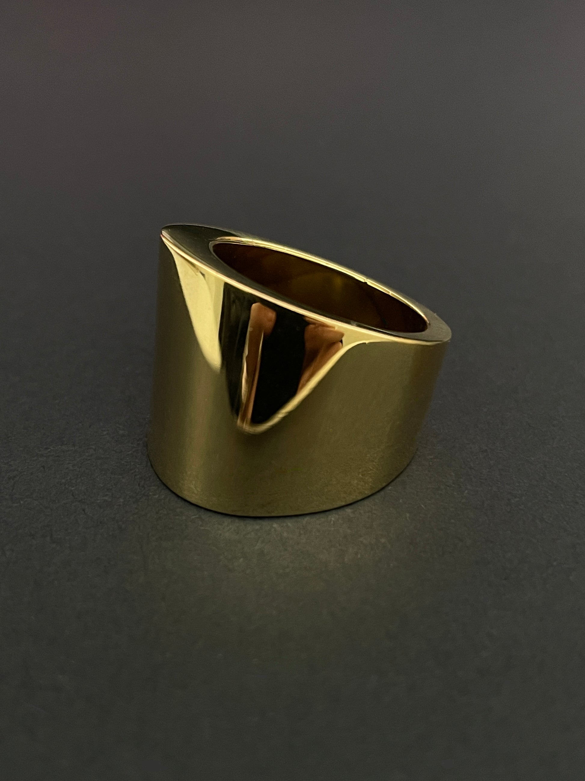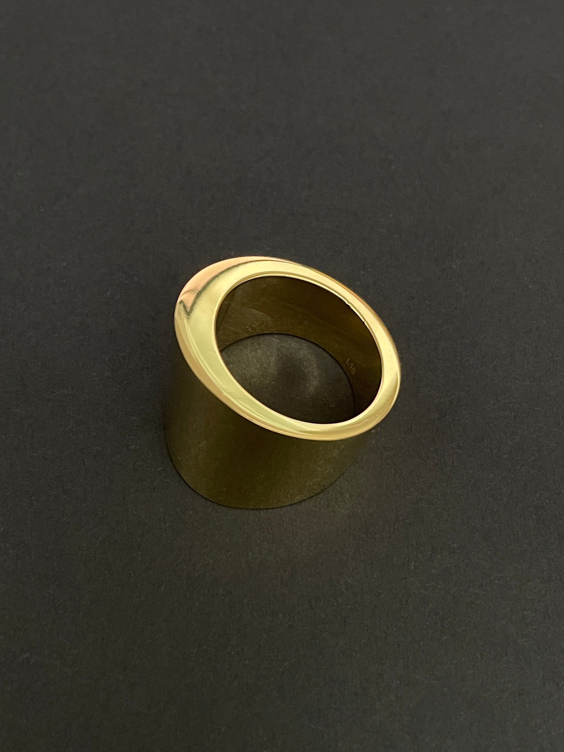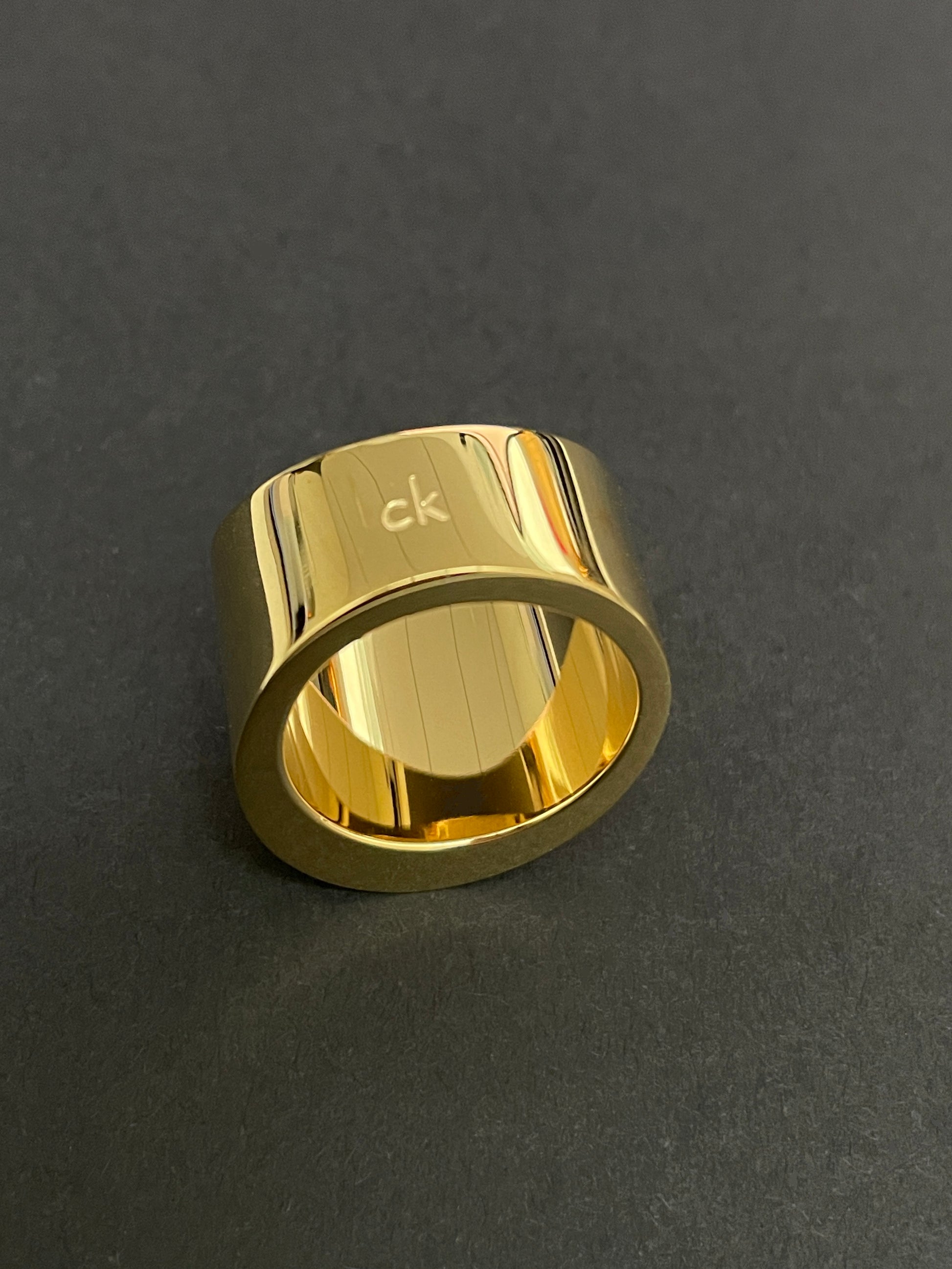 Bague Calvin Klein légèrement asymétrique en acier inoxydable doré. Très bon état général, quasi jamais portée. T. 60.Gravée CK à l'extérieur et L10 (taille CK).